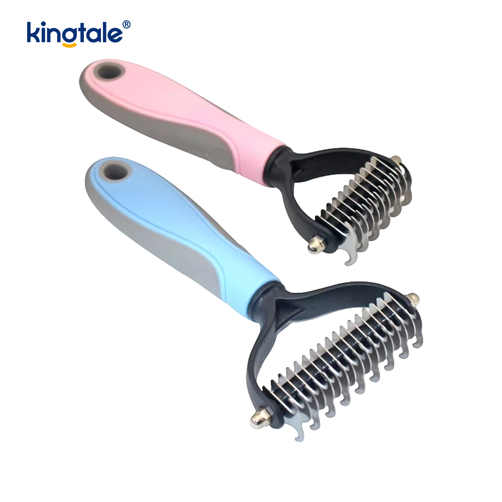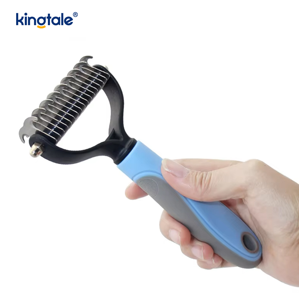 The Kingtale Double-Sided Deshedding Brush is a professional-grade grooming tool engineered with dual-functionality to address both surface debris and deep undercoat removal. Its innovative double-sided design combines a fine-tooth comb for detangling topcoat and capturing loose hair, with a precisely angled undercoat rake that penetrates deep into the dense fur to extract safely trapped undercoat without irritating the pet's skin. Specifically developed for pet owners seeking salon-quality results at home, this brush Effectively reduces shedding up to 95% while promoting healthier skin and coat condition through gentle yet thorough massage stimulation during each brushing session.